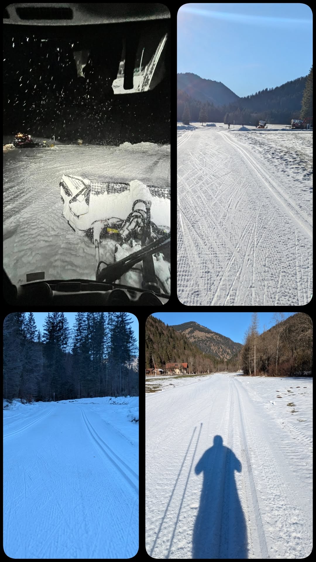 So war’s heute Vormittag. Null Grad, strahlender Sonnenschein und unglaublich gute Bedingungen! Warum? Es ist sicher noch nicht so bekannt aber Anfang der Woche wurde wieder sehr engagiert an der Loipe gearbeitet (Bild1). U.a. das Bachbett (Bild links unten) wurde mit noch verfügbarem Maschinenschnee bedeckt, so dass jetzt dort wieder TOPP Bedingungen für Cl & Sk herrschen. Nur ganz oben wird’s schlechter. Bitte dann halt einfach umdrehen. Der Rest vom Klooaschertal ist bis zum nächsten Schneefall (kommt bald…) Geschichte.
