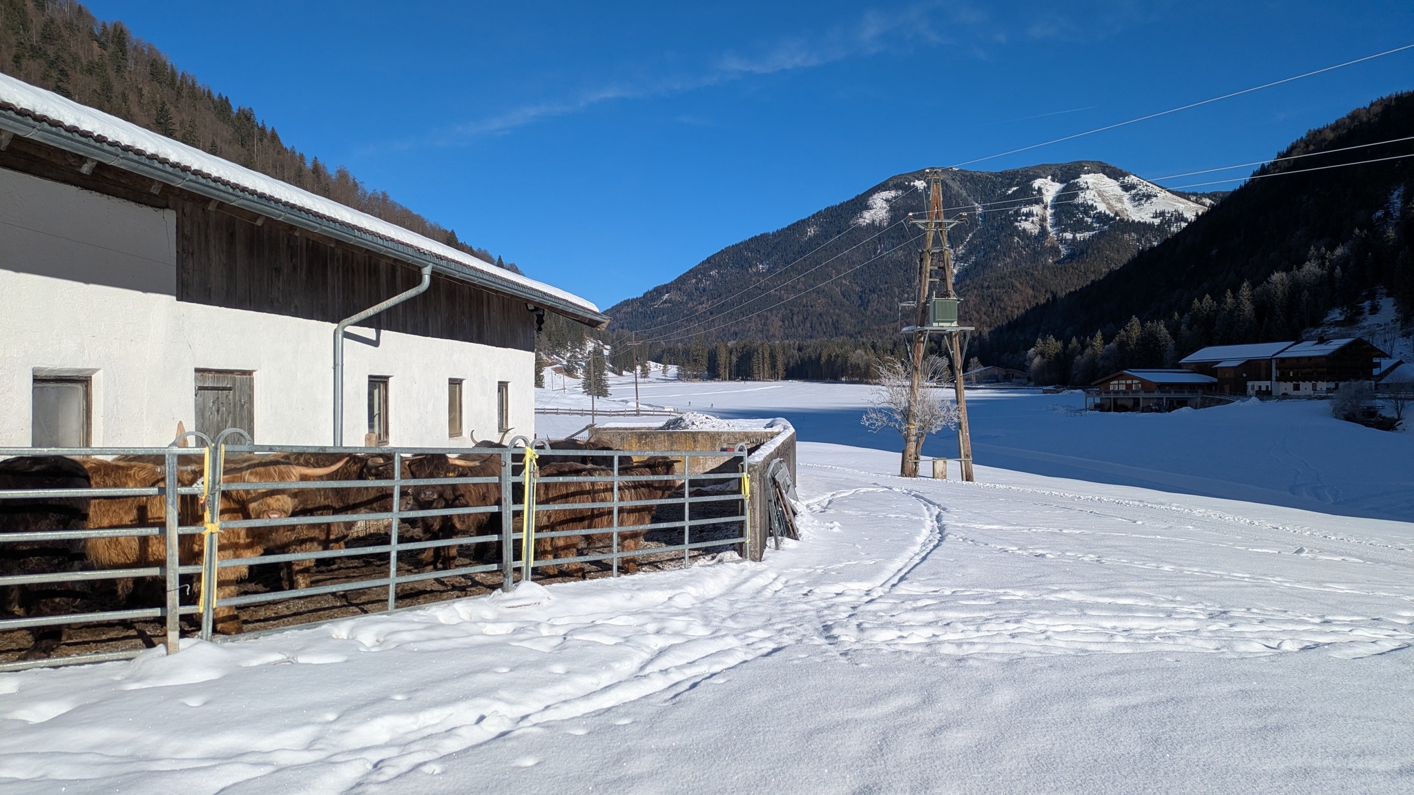 – Loipe in allerbesten Bestzustand. Die Abfahrt ist jetzt nicht mehr eisig und für jeden easy zu bewältigen. Hinten im Tirol glitzern Millionen von Raureif Kristallen, magisch. Und dann bin ich an meinen „Freunden“ den Gehörnten vorbeigelaufen. Die musste ich fotografieren.